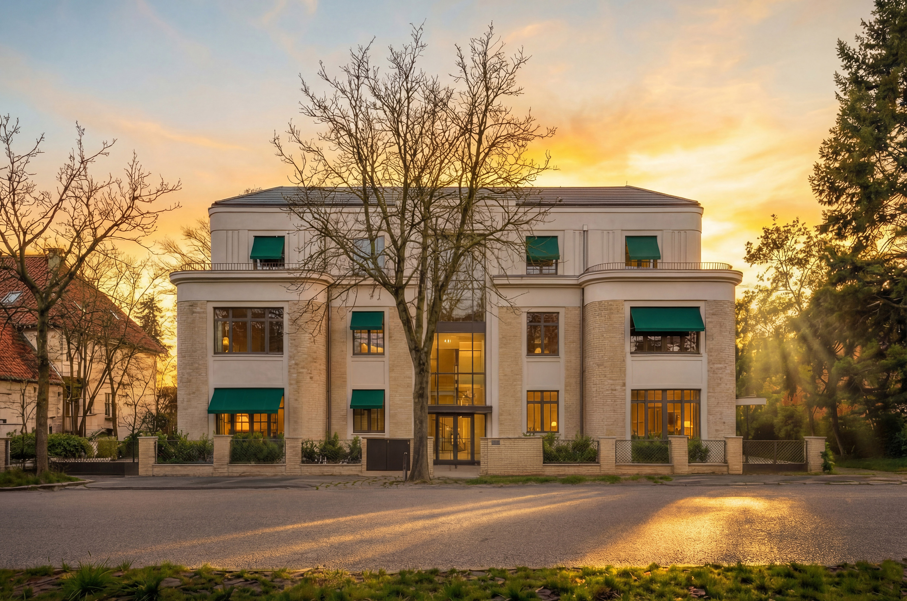 Die Villa Im Dol wurde vom renommierten Berliner Architekten Tobias Nöfer entworfen und erinnert mit ihren abgerundeten Ecken und geschwungenen Formen an den ästhetischen Aufbruch in die Moderne: Erich Mendelssohn, Hans Poelzig – weltberühmte Architektennamen schwingen hier mit.