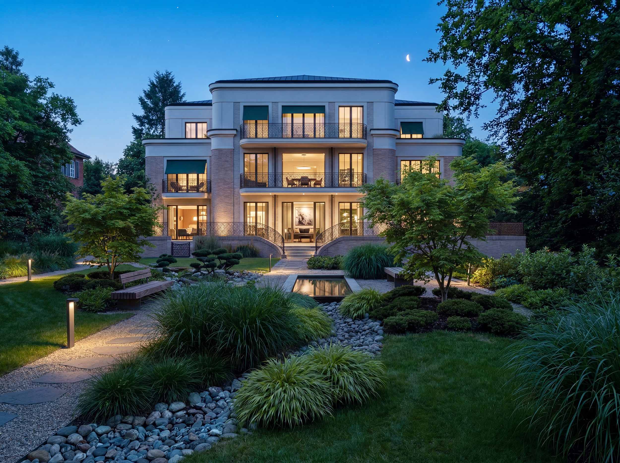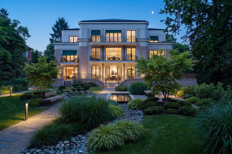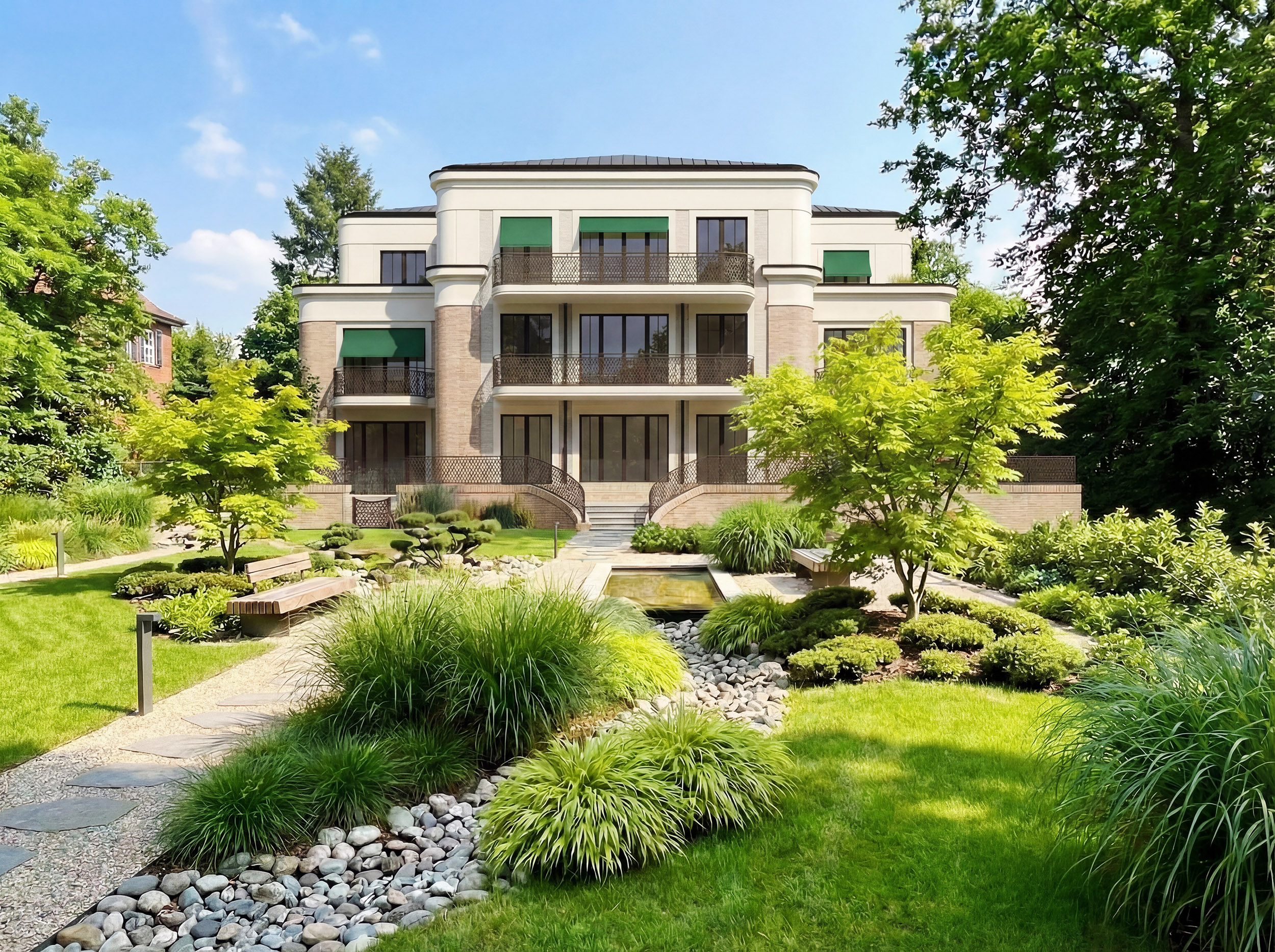 Die Residenzen überzeugen mit weitläufigen Terrassen und Balkonen, die großzügigen Freiraum im Grünen bieten. Der liebevoll angelegte Landschaftsgarten mit seinem original englischen Teepavillon bildet ein stilvolles Refugium – einen gemeinschaftlich nutzbaren Ort der Ruhe und des entspannten Miteinanders.